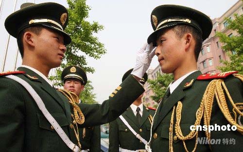 4月30日,北京飯店舉行迎奧運(yùn)倒計(jì)時(shí)100天千人簽字活動,北京飯店被國際奧委會正式確立為第29屆奧林匹克大家庭總部飯店,隨著2008北京奧運(yùn)會的臨近,飯店開展了以奧運(yùn)為目標(biāo)的服務(wù)技能比賽,投入到奧運(yùn)接待服務(wù)工作中。北京飯店千名員工,以及天安門國旗護(hù)衛(wèi)隊(duì)、中國人民解放軍軍樂團(tuán)參加奧運(yùn)倒計(jì)時(shí)100天儀式。 圖為在北京飯店奧運(yùn)倒計(jì)時(shí)100天儀式上天安門國旗護(hù)衛(wèi)隊(duì)?wèi)?zhàn)士整理軍容。 中新社發(fā) 錢興強(qiáng) 攝