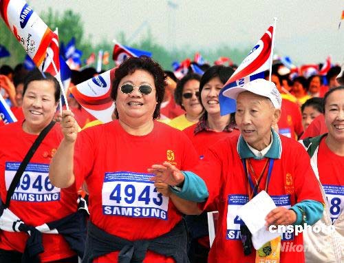 北京奧運會倒計時100天群眾馬拉松接力活動暨2008年北京國際長跑節(jié),4月30日上午在北京國家體育場公共區(qū)隆重舉行。中新社發(fā) 宋吉河 攝