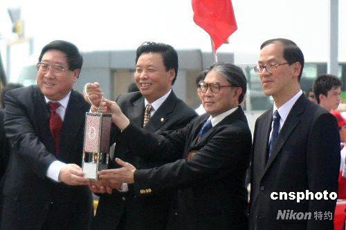 北京奧組委執(zhí)行副主席楊樹安(左二)與香港奧委會(huì)會(huì)長霍震霆(右二)、中聯(lián)辦主任高祀仁(左一)等共舉圣火燈。 中新社發(fā) 沈晨 攝