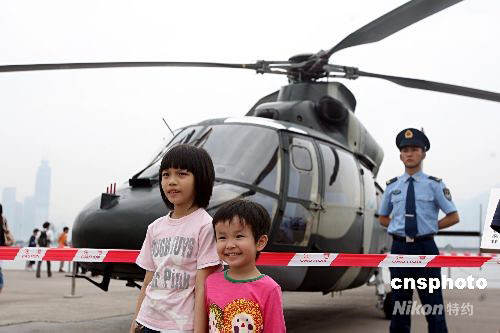 圖為市民在昂船洲軍營(yíng)與軍用直升機(jī)合影。中新社發(fā) 武仲林 攝