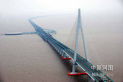 備受矚目的世界第一跨海大橋——杭州灣跨海大橋五月一日下午舉行了簡(jiǎn)潔的通車儀式,正式進(jìn)入試運(yùn)營(yíng)階段。圖為雄偉的杭州灣跨海大橋航拍美景。