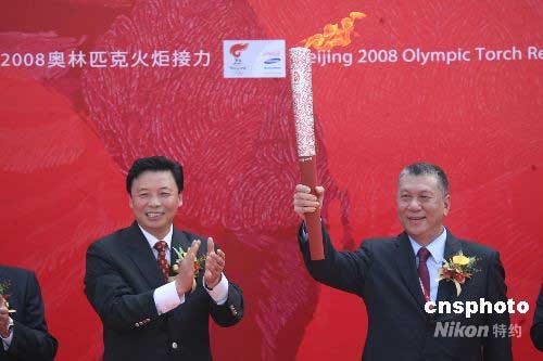 圖為澳門(mén)特別行政區(qū)行政長(zhǎng)官何厚鏵(右) 、北京奧組委執(zhí)行副主席楊樹(shù)安等出席起跑儀式。中新社發(fā) 武仲林 攝