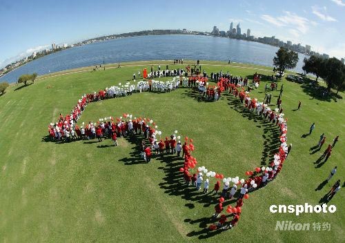 三所西澳大利亞中文學校的二百多名7-14歲的孩子在西澳首府珀斯天鵝河畔,組成北京奧運會徽圖及澳大利亞地圖表達對北京奧運的支持。中新社發(fā) 高周丹 攝