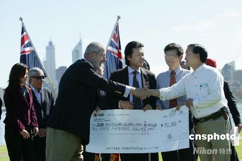 13個(gè)西澳華人社團(tuán)的代表向西澳參加北京奧運(yùn)的運(yùn)動(dòng)員捐贈(zèng)了五萬(wàn)澳幣(近四十萬(wàn)人民幣),表達(dá)西澳洲華人對(duì)澳大利亞體育事業(yè)的支持。 中新社發(fā) 高周丹 攝