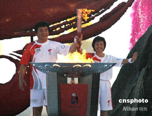圖:成龍與三亞女鎮(zhèn)長共同點(diǎn)燃三亞圣火盆 (2)