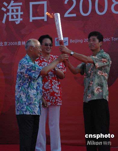 5月6日,北京奧運圣火開始在大陸境內(nèi)第一個省會城市海口傳遞。圖為北京奧組委執(zhí)委、國際奧委會委員、中國奧委會名譽(yù)主席何振梁(左)作為圣火使者將火炬交接給中共海南省委副書記于迅(右一)。中新社發(fā) 王辛莉 攝