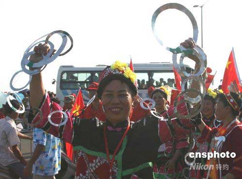 5月6日上午8時10分許,北京奧運圣火在海南省海口市傳遞,這是圣火在海南傳遞的最后一站,數(shù)十萬民眾走上街頭祝賀奧運圣火在?趥鬟f。圖為少數(shù)民族笑逐顏開迎接奧運圣火。中新社發(fā) 尹海明 攝
