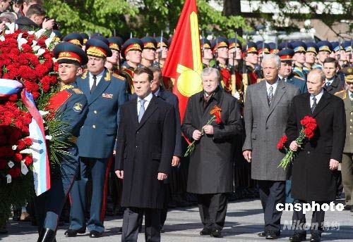 5月8日上午,俄羅斯新任總統(tǒng)梅德韋杰夫來到克里姆林宮西北側紅墻下的亞歷山大花園,向無名烈士墓敬獻花圈,紀念衛(wèi)國戰(zhàn)爭勝利63周年。俄前任總統(tǒng)普京、看守總理祖布科夫、議會兩院議長米羅諾夫和格雷茲洛夫等高官政要參加了儀式。這是梅德韋杰夫就任總統(tǒng)后的首場正式活動。中新社發(fā) 田冰 攝