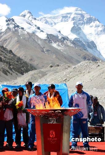 圖為在珠峰腳下熊熊燃燒的高原圣火臺。 中新社發(fā) 盛佳鵬 攝