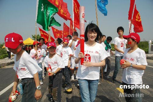 5月10日,模擬火炬?zhèn)鬟f途中。當(dāng)天,安徽師范大學(xué)舉辦“奧運(yùn)心,中華情”模擬奧運(yùn)火炬?zhèn)鬟f活動,主辦方邀請了學(xué)生、教師、老人、殘疾人等30人組成火炬手,體驗(yàn)奧運(yùn)火炬手的光榮與快樂,表達(dá)對北京奧運(yùn)會的美好祝福。 中新社發(fā) 閔澤未 攝