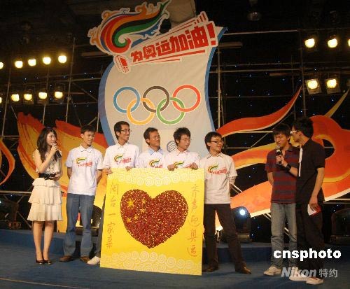 2008年5月11日,臺灣學(xué)子在展示為奧運會創(chuàng)作的祝福禮物。當(dāng)日,為了慶祝北京奧運會圣火在福州成功傳遞, 閩臺學(xué)子牽手兩岸共迎奧運圣火活動舉行。 中新社發(fā) 張 斌 攝