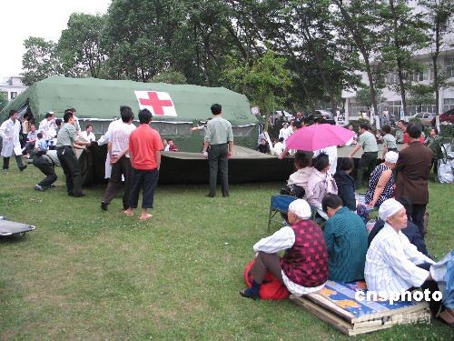四川汶川縣發(fā)生7.8級(jí)地震。成都受到波及,也發(fā)生5.4級(jí)地震。位于成都北郊的成都軍區(qū)總醫(yī)院接收了來(lái)自地震災(zāi)區(qū)的100多名傷員。在積極組織搶救的同時(shí),醫(yī)院搭建10余頂大型帳篷,將住院的1000多名患者全部安全轉(zhuǎn)移。中新社發(fā) 朱琥 攝