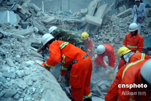 十二日下午兩點(diǎn)三十分左右,受四川汶川地震波及,重慶市梁平縣文化鎮(zhèn)一小學(xué)教學(xué)樓發(fā)生垮塌,目前已造成五名學(xué)生死亡,三十六人受傷。圖為消防隊(duì)員正在對(duì)被掩埋學(xué)生進(jìn)行搜救。 中新社發(fā) 郭晉嘉 攝