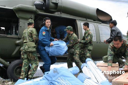 5月14日,成都軍區(qū)某陸航團(tuán)四架直升機(jī)滿載帳篷、礦泉水等災(zāi)區(qū)急需物資抵達(dá)四川大地震震中汶川縣。這是災(zāi)后第一次成功降落到汶川災(zāi)區(qū)的飛機(jī)。圖為解放軍官兵正在分發(fā)救災(zāi)物資。中新社發(fā) 張雷 黃龍 攝