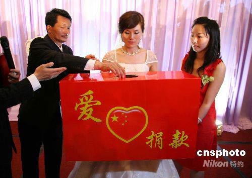 新娘邱媛媛和新郎饒新的家人在婚禮現(xiàn)場向四川災(zāi)區(qū)捐贈(zèng)2萬元人民幣。中新社發(fā) 鐘山 攝