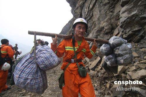 經(jīng)過水路運輸,武警步行十多公里將救災(zāi)物資肩挑背扛運送到汶川縣映秀鎮(zhèn)。中新社發(fā) 郭國權(quán) 攝