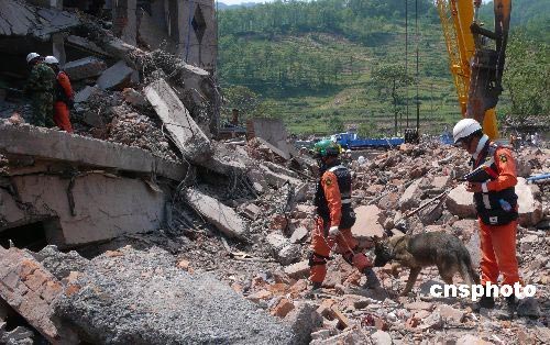 5月19日,中韓兩國救援隊員四川什邡鎣華鎮(zhèn)一處樓房廢墟上,聯(lián)手搜救被困者。 中新社發(fā) 張曉理 攝