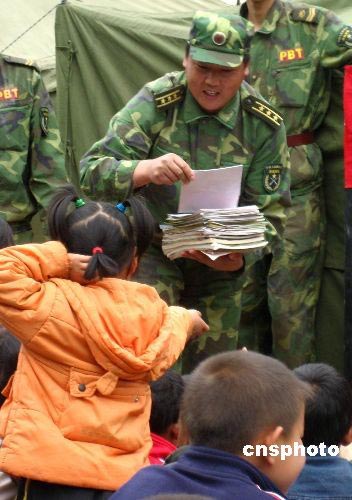 5月20日,四川省平武縣南壩鎮(zhèn)埡頭坪村,解放軍某裝甲師炮兵團(tuán)在這里建立的“托起明天的太陽”災(zāi)區(qū)戰(zhàn)地小學(xué)正式開課。圖為政委汪應(yīng)成給孩子們發(fā)課本。 中新社發(fā) 汪景磊 攝