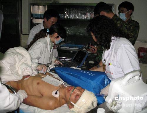 5月21日,四川省綿竹縣被埋8天8夜零4小時(shí)(196個(gè)小時(shí))的天池煤礦礦工賴元平被救出,經(jīng)解放軍255醫(yī)院醫(yī)療隊(duì)急救后由成都軍區(qū)直升飛機(jī)接至成都軍區(qū)總醫(yī)院救治。傷者在該院作CT檢查時(shí)被發(fā)現(xiàn)腦有內(nèi)巨大血腫,時(shí)刻有生命危險(xiǎn),成都軍區(qū)總醫(yī)院顧建文副院長和解放軍301總醫(yī)院周定標(biāo)教授研究后決定立即手術(shù)。手術(shù)由顧建文副院長主刀,1小時(shí)40分鐘后手術(shù)完成,術(shù)后傷員生命體癥平穩(wěn)。中新社發(fā) 朱琥姚遠(yuǎn) 攝