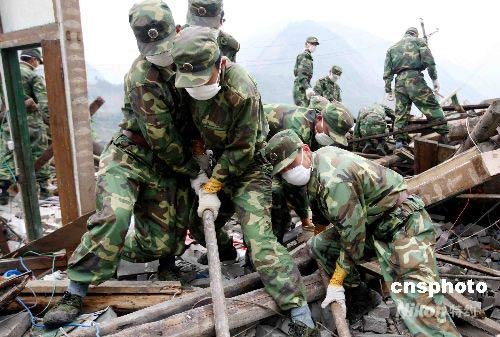 5月22日,在汶川震中災(zāi)區(qū)映秀鎮(zhèn)的鐵軍官兵繼續(xù)進(jìn)行搜尋工作。中新社發(fā) 曾憲平 攝