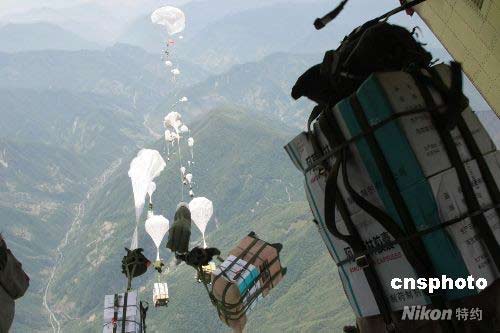 5月16日,中國空軍航空兵某師在向四川地震災(zāi)區(qū)空投救災(zāi)物資?哲姲l(fā)揮空中運(yùn)輸優(yōu)勢,連續(xù)出動大型運(yùn)輸機(jī),不間斷大規(guī)模向四川災(zāi)區(qū)投送災(zāi)民急需的藥品、食物、帳篷等急需的生活用品。中新社發(fā) 譚超 攝