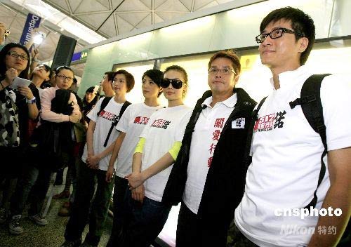 將于明日啟程去四川的歌星譚詠麟(右二)趕來送行。中新社發(fā) 王麗南 攝