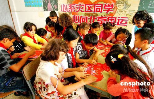 5月29日上午,浙江義烏群星學(xué)校舉行“心系災(zāi)區(qū)學(xué)生 心向北京奧運” 慶“六一” 活動。全校2300多名學(xué)生與147名外籍學(xué)生,在各自的心愿卡上寫下祝福話語,祝愿四川地震災(zāi)區(qū)小朋友“六一”快樂,祝愿北京奧運會圓滿成功。中新社發(fā) 張建成 攝