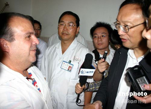 5月30日上午,中國外交部部長楊潔篪來到四川省人民醫(yī)院,看望在這里救治地震災(zāi)區(qū)傷病員的古巴醫(yī)療隊,感謝他們給予四川地震災(zāi)區(qū)民眾的關(guān)心,并高度贊揚了他們的國際人道主義精神。中新社發(fā) 楊杰 攝