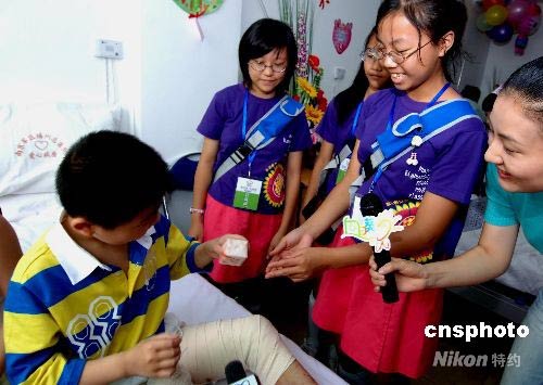 澎湖馬公小學音樂班的3位同學向在此接受治療的四川綿竹9歲的丁磊送上節(jié)日禮物和祝福。中新社發(fā) 劉可耕 攝