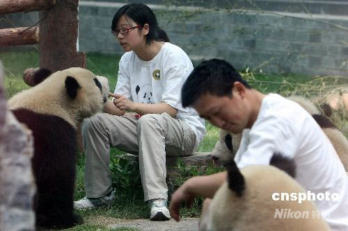 6月5日上午,八只臥龍“奧運(yùn)大熊貓寶寶”在北京動(dòng)物園的新家中首次公開亮相。這些1歲多的“小國寶”不時(shí)需要臥龍來的飼養(yǎng)員用四川鄉(xiāng)音安撫它們在5·12大地震中受到驚嚇的心靈。 中新社發(fā) 任晨鳴 攝
