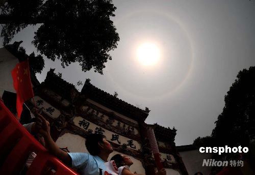 6月5日,奧運圣火湖南傳遞在韶山結束后,天空出現(xiàn)日暈奇觀,毛氏宗祠前為圣火歡呼的人們仰望奇觀。 中新社發(fā) 廖攀 攝