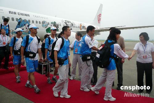 六月五日下午十七時四十五分,承載北京奧運(yùn)會圣火火種的中國國航圣火號專機(jī),平安抵達(dá)國際旅游名城廣西桂林,奧運(yùn)圣火正式開始在廣西這個少數(shù)民族自治區(qū)的傳遞活動。六月六日、七日、八日,奧運(yùn)圣火將分別在廣西桂林、南寧、百色傳遞。中新社發(fā) 周利朔 攝