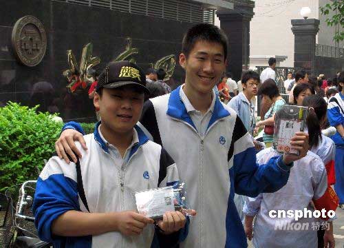 6月7日上午,“北京市2008年普通高等學(xué)校招生全國統(tǒng)一考試”第一天,地處北京西皇城根的京城名校北京四中考點(diǎn)門前,考生寧碩碩(左)一早便和同學(xué)匯聚,等待進(jìn)入考場。中新社發(fā) 鄒憲 攝