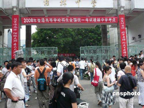 全國高考第一天,桂林中學高考點。2008年廣西高考報名人數(shù)30萬3778人,首次突破30萬人,比2007年增長3.20%。中新社發(fā) 周利朔 攝