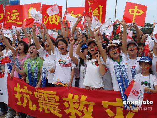 當(dāng)?shù)孛癖娕e著國旗和奧運(yùn)五環(huán)旗,高喊“中國加油”、“四川加油”。中新社發(fā) 黃艷梅 攝