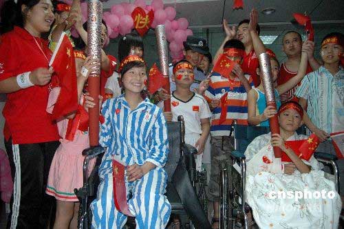 傳遞結(jié)束后,五名火炬手趕到廣西醫(yī)科大學(xué)附屬醫(yī)院,看望在這里治療的四川地震災(zāi)區(qū)傷員,并讓他們與“祥云”親密接觸,了卻看奧運圣火傳遞的心愿。中新社發(fā) 蔣雪林 攝