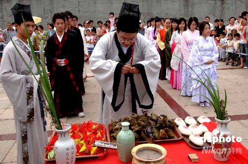 6月7日,近百名福建漢服愛(ài)好者在福州倉(cāng)前公園閩江畔舉行戊子年端午祭屈原儀式。儀式按照古禮進(jìn)行,分主祭宣讀祭文、獻(xiàn)爵、齊誦屈原名篇、行拜禮等。中新社發(fā) 劉可耕 攝