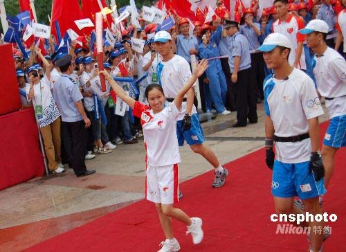 6月8日上午,北京奧運(yùn)火炬在革命老區(qū)廣西百色平果縣進(jìn)行傳遞,第一棒火炬手是平果縣希望小學(xué)校長、壯族姑娘周標(biāo)亮,她曾受到鄧小平的資助。上世紀(jì)九十年代,鄧小平以“一個老共產(chǎn)黨員”的名義向希望工程捐款5000元,這筆捐款被落實(shí)到平果縣希望小學(xué),使25名瀕臨失學(xué)的貧困學(xué)生得以繼續(xù)學(xué)業(yè),周標(biāo)亮就是當(dāng)年得到資助的學(xué)生之一。后來,這位壯族姑娘考取了一所師范學(xué)校,畢業(yè)后她回到培養(yǎng)自己的平果縣希望小學(xué)任教,2005年被任命為該校校長。中新社發(fā) 劉萬強(qiáng) 攝
