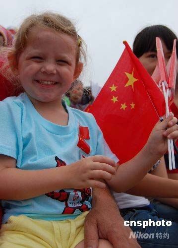 圖為一位外國(guó)小姑娘手持中國(guó)國(guó)旗歡迎圣火。中新社發(fā) 劉萬(wàn)強(qiáng) 攝