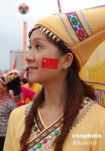 圖為一位壯族姑娘臉上貼著中國國旗圖案歡迎圣火。中新社發(fā) 劉萬強(qiáng) 攝