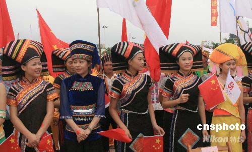 壯族姑娘身著民族盛裝喜迎奧運(yùn)圣火。 中新社發(fā) 周兆軍 攝