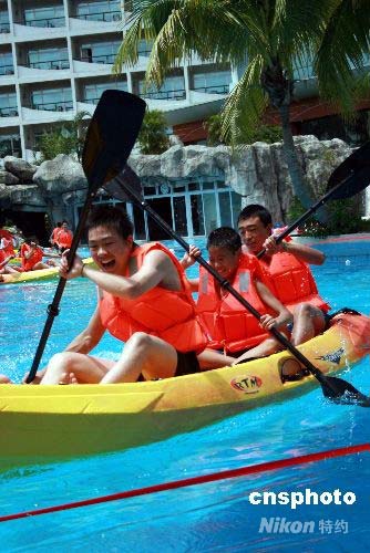 孩子們在三亞山海天大酒店參加賽龍舟比賽。中新社發(fā) 關(guān)向東 攝