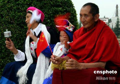 在云南民族村里一名喇嘛和兩名藏族同胞一起等待圣火到來。 中新社發(fā) 廖攀 攝