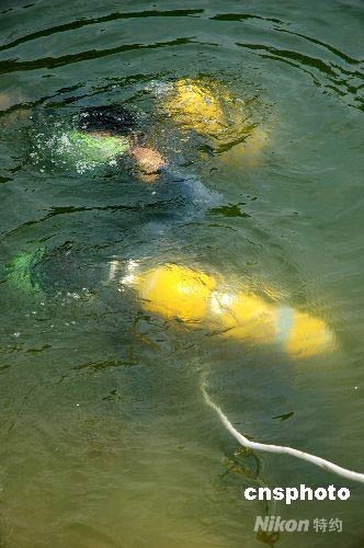 經(jīng)過4名潛水員近2個(gè)小時(shí)的連續(xù)作業(yè),終于將水庫最底下的2個(gè)放水口拉開。中新社發(fā) 李唐 攝