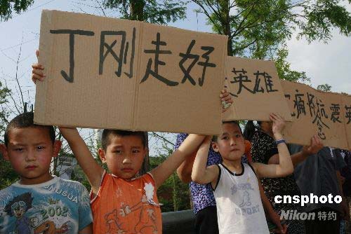 6月9日下午,四川省遂寧市數(shù)千群眾自發(fā)來(lái)到烈士陵園公墓,送別遂寧市優(yōu)秀的抗震救災(zāi)英雄丁剛。今年40歲的丁剛,是遂寧市船山區(qū)一名普通居民,6月3日參加遂寧市應(yīng)急民兵營(yíng)一連突擊隊(duì),赴災(zāi)區(qū)抗震救災(zāi)。5日18時(shí)30分許在映秀鎮(zhèn)搜尋失事直升飛機(jī)時(shí),遇山體滑坡,為救戰(zhàn)友,被飛石擊中頭部,不幸犧牲。6月9日下午3點(diǎn)30分,遂寧市政府、遂寧軍分區(qū)為丁剛同志舉行遺體告別儀式,以告慰英靈。中新社發(fā) 鐘 敏 攝