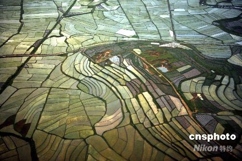 6月10日,奧運圣火將在云南麗江進行傳遞。6月9日,從飛機上俯瞰麗江碧綠的農(nóng)田仿如翡翠。中新社發(fā) 廖攀 攝