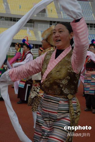 圖:藏族群眾載歌載舞歡迎奧運(yùn)圣火