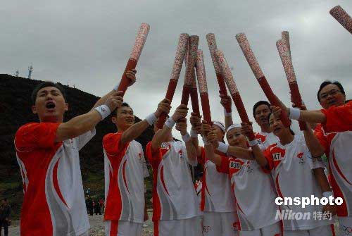 在圣火傳遞結(jié)束儀式的現(xiàn)場,已經(jīng)傳遞完成的10余位火炬手高舉祥云火炬齊聲為中國加油,祝福北京奧運(yùn)。 中新社發(fā) 石雨 攝