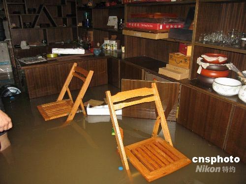 積水涌入居民家中和臨街商鋪,圖為一家茶葉店“泡湯”。中新社發(fā) 周丹鈺 攝