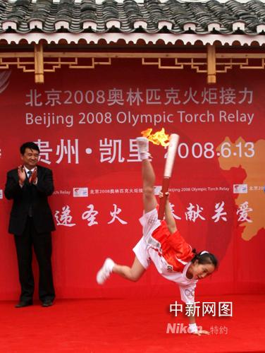6月13日,奧運(yùn)火炬在貴州黔東南傳遞,第一棒火炬手、體操運(yùn)動(dòng)員林麗接過火炬后,做起了精彩的體操動(dòng)作,引得現(xiàn)場一陣歡呼。記者周兆軍攝